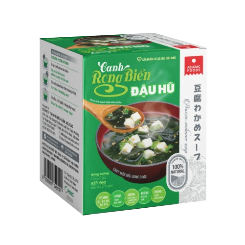 Canh rong biển đậu hũ được chọn lọc từ những lá rong biển wakame Nhật Bản, kết hợp cùng đậu hũ sấy thăng hoa, tạo nên hương vị thơm ngon, thanh đạm.